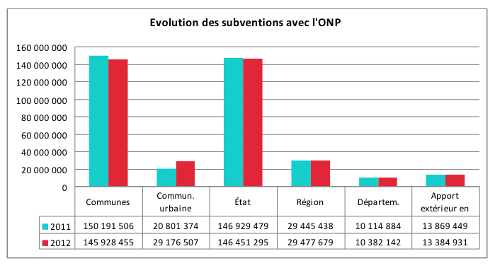Les opéras doivent aussi faire face à des baisses de subventions. Nous pouvons prendre exemple sur l’évolution de celles des opéras entre 2011 et 2012, qui peuvent être illustrées par le graphique statistique de gauche concernant l’Opéra National de Paris (ONP, qui est constitué de l’Opéra Bastille et du Palais Garnier).