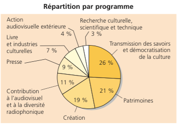 Diagramme circulaire représentant le budget du ministère de la culture et de la communication, tiré des chiffres clés 2013 ; http://www.culturecommunication.gouv.fr/Politiques-ministerielles/Etudes-et-statistiques/Les-publications/Collections-d-ouvrages/Chiffres-cles-statistiques-de-la-culture/Chiffres-cles-2013